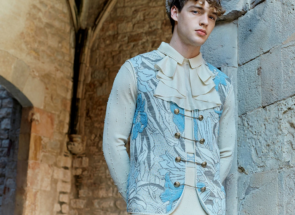 “Baroque explores emotion, power, and the forces ofnature through dramatic light and shadow, exaggerated forms, and dynamic compositions. Inspired byreligious devotion, scientific enlightenment, and courtly opulence, it blends order and chaos, stillness, and motion, creating acaptivatingexpression ofaristicgrandeur and emotional intensity.Yarns blending viscose, polyester, and cotton-linen combine silky smoothness,moisture absorption, durability, elasticity, and natural textures, offering greater creative possibilities for knitwear design. Their rich textures and versatile proper-ties provide garments with uniquetactile and visual effects, making them suitable for everything from lightweight, flowing summer knits to warm and durable early autumnpieces, balancing practicality with environmental value.